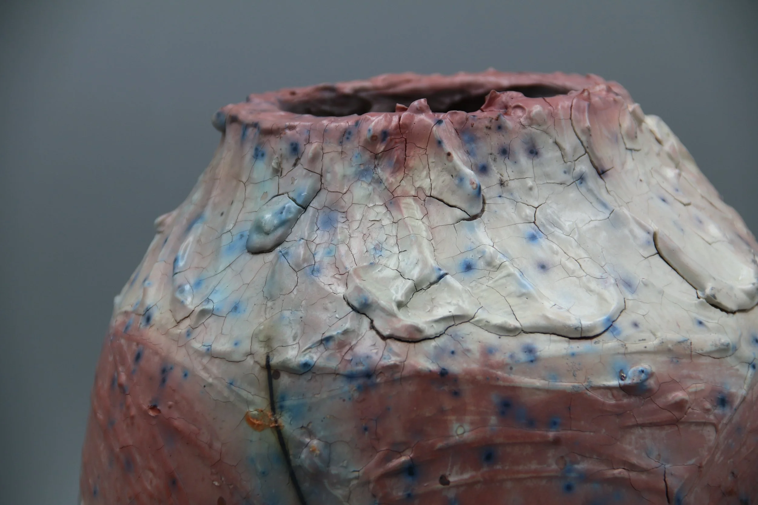 “This was one of the last-minute pieces made for the Texas City Art Festival. It's a wheel throw pot made from Buffalo Wallow clay and cover with a low-fire slip before applying terrasigilatta. I applied multiple coats of ferric chloride and was expecting it to be re. As you can see, it wasn't the case. I think it was due to me saggar firing in an electric kiln and my saggar cracking, I like the pink finish, though. I also wrapped the vessel with copper wire, then put it inside a bag with miracle gro and epsom salt spray fixed to the inside. This this was one and done in regards to the firing. Packing the saggar tightly for direct contact helps a lot with getting the effects of things like the miracle gro to show on the surface.”