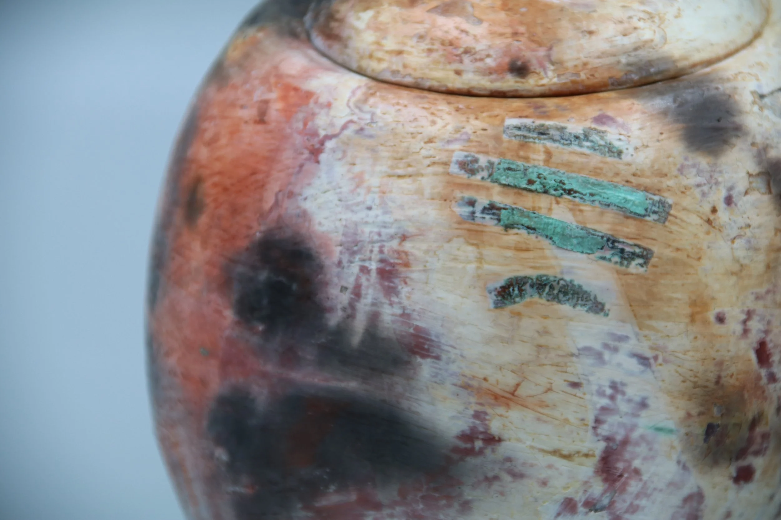 Composition 17“Finished this one at @3rdcoastclay a few weeks ago when I was doing a barrel firing with my students and managed to obtain the finish in one go this time. I did a wash of ferric chloride. Then, I wrapped it in miracle gro soaked twine and copper wire. Finished it up with some masking and copper tape before pouring a wash of copper sulfate I made with a student. There was residual tape that ended up oxidizing after the firing, I'm definitely not opposed to it. I am thinking about revisting thicker applications of slips and messing with additives for the next few forms, any suggestions?”
