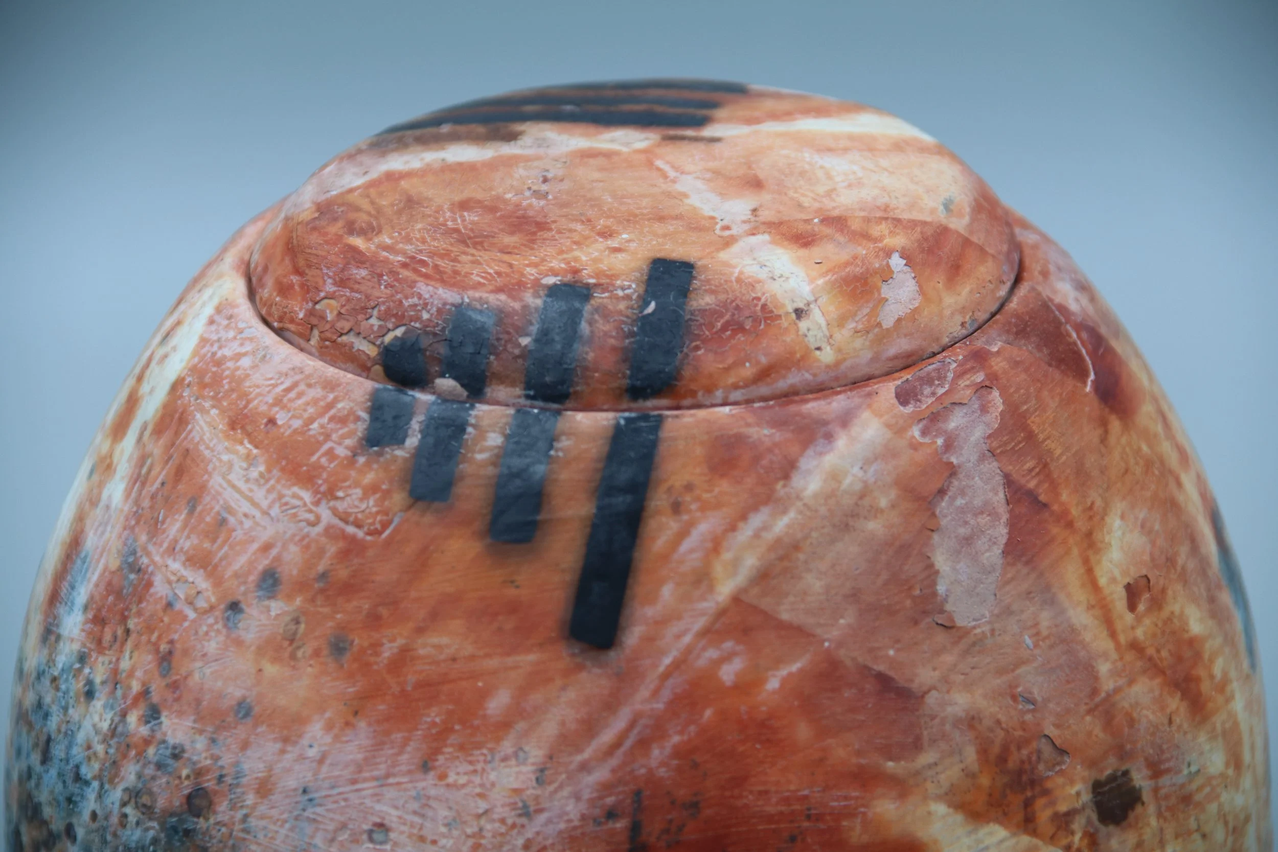 Composition 16“I had to fire this one twice to get these results. It was first barrel fired and ended up being covered in so much soot that it was black with some subtle changes. (last photo in group) I did the second firing in an electric kiln to clear up soot and see what transfer onto the form. I'm still using ferric chloride for the reddish blushes, but I decided to test masking tape, copper tape, and coconut fiber with colorants spray fixed onto it as well. I like the results so far, I'm still looking to test more.”