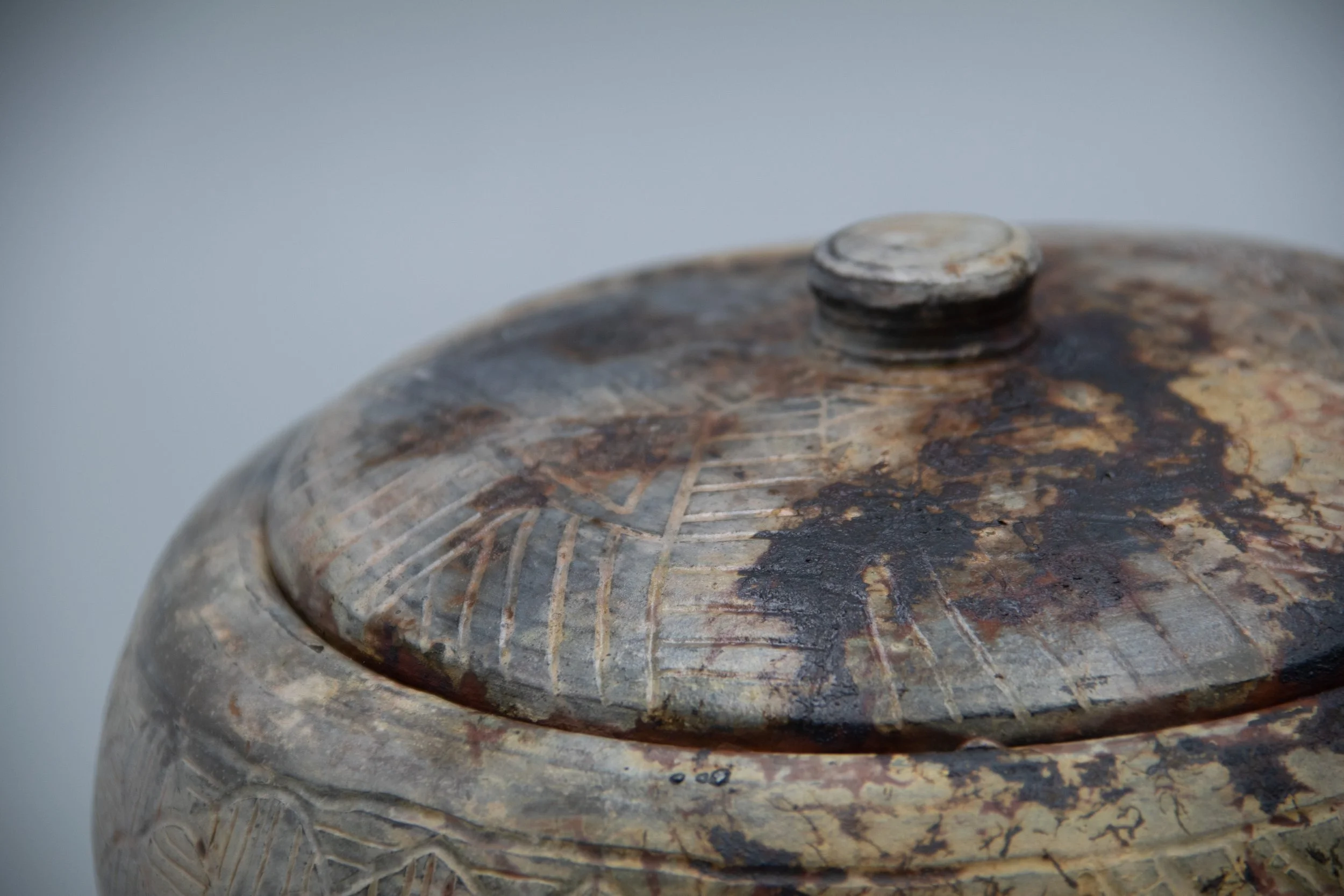 Composition 22“I wanted to add more to the surface for this one, so I incorporate sgraffito and the use of mica powder in my terrasigilatta mixes. This form was wheelthrown and given a layer of black under glaze before craving the surface. After a bisque to cone 08, I added the mica/terrasigilatta mix, covered with steel wool, and glazed the inside. Saggar fired to cone 04 with a hand full of sawdust and done.”