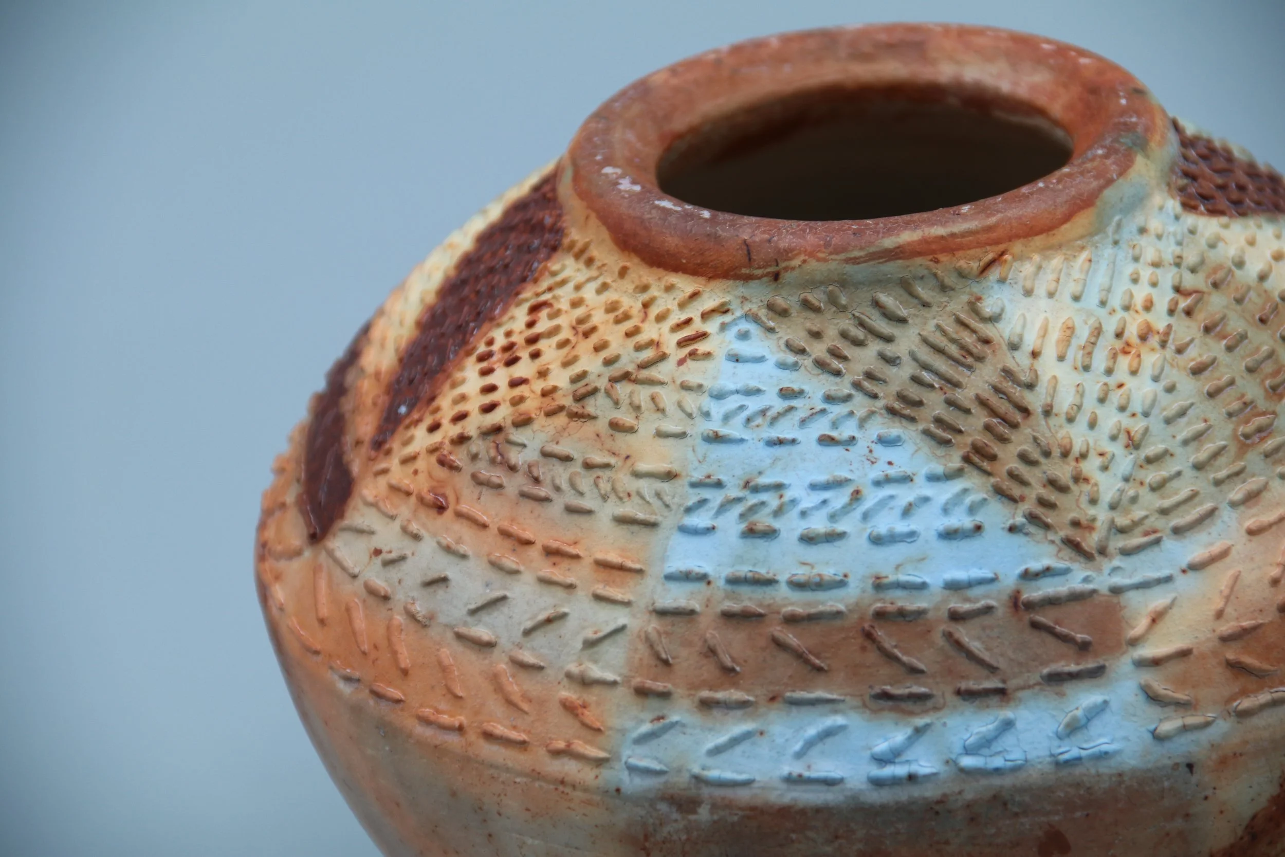 Composition 19“A scarification pot I made some time ago. It has been through 8 firing minimum and I can't exactly say I'm satisfied with the overall surface. I've been having issues with getting more carbon trapped into the body of the piece and I'm throwing in the towel. I may have overfired it in one of the first firings or I need to tweak my saggar more. I still do enjoy certain qualities of this one. I'll look into doing more banding with the scarification texture for some future pieces. However, I won't be as experimental with the ferric chloride without testing on test tiles first. haha I was putting colorants in one of my washes to see if I could get a cool effect, and it just got darker. Lesson learned and some things to think about for future works. The blues are from washes of cobalt sulfate and the blushes of red from the various washes of ferric chloride. (I also used steel wool for the web-like lines)”